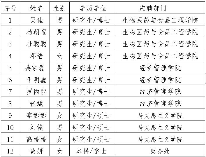 根據(jù)陜西省人社廳《關(guān)于陜西省事業(yè)單位公開招聘人員辦法》規(guī)定及《商洛學(xué)院2020年人才招聘計(jì)劃》,經(jīng)過資格審查、試講、專家面試等環(huán)節(jié)考察,并經(jīng)院長辦公會2020年4月10日研究,同意招聘吳佳等12位同志來我校工作,現(xiàn)予以公示。如有異議,請于2020年4月16日前向人事處或紀(jì)委辦公室反映。