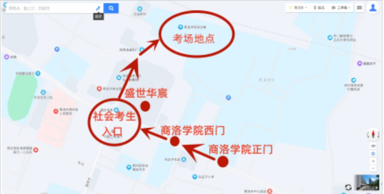 社會考生考場,設(shè)置在商洛學(xué)院北新街校區(qū)8號教學(xué)樓。請此類考生由商洛學(xué)院西北門入場(盛世華宸西側(cè)路口進(jìn)入)。
