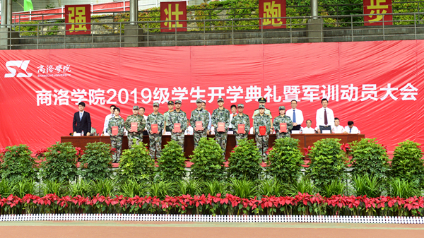 天朗氣清、秋風(fēng)送爽,巍巍學(xué)府、德渥群芳。9月5日上午,我校2019級(jí)學(xué)生開學(xué)典禮暨軍訓(xùn)動(dòng)員大會(huì)在學(xué)校體育場隆重舉行。黨委書記龍治剛、校長范新會(huì)、紀(jì)委書記王思懷、黨委副書記彭虎軍,副校長劉寶盈、劉勇,商州區(qū)人民武裝部部長曹建明上校,武警商洛支隊(duì)副參謀長、軍訓(xùn)團(tuán)團(tuán)長呂喆中校,2015屆校友、第44屆世界技能大賽銅獎(jiǎng)獲得者、中航工業(yè)陜西飛機(jī)制造公司職工高雨楠出席大會(huì)。各二級(jí)學(xué)院(部)黨政主要負(fù)責(zé)人、有關(guān)職能部門負(fù)責(zé)人,2019級(jí)全體新生及家長代表參加大會(huì)。大會(huì)由彭虎軍主持。