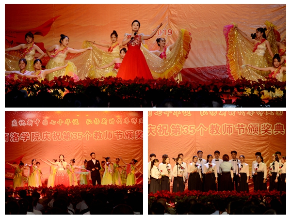 在全場(chǎng)熱烈的掌聲中,校領(lǐng)導(dǎo)分別為獲得陜西省教學(xué)管理先進(jìn)集體、我校2019年先進(jìn)集體、我校2018年目標(biāo)責(zé)任考核先進(jìn)單位、人才工作榮譽(yù)獲得者、科技工作榮譽(yù)獲得者、教學(xué)工作榮譽(yù)獲得者及獲得優(yōu)秀教師、優(yōu)秀教育工作者的集體和個(gè)人頒發(fā)了獎(jiǎng)牌和榮譽(yù)證書(shū),學(xué)生代表為獲得2019年“我最喜愛(ài)的老師”稱(chēng)號(hào)的教師頒發(fā)榮譽(yù)證書(shū)。頒獎(jiǎng)?lì)I(lǐng)導(dǎo)與受表彰的教師們親切握手、合影留念,真摯祝福他們節(jié)日快樂(lè)、萬(wàn)事如意。現(xiàn)場(chǎng)學(xué)生紛紛上臺(tái)為受表彰的教師們送上鮮花和祝福,感謝老師們的辛勤培育和付出。