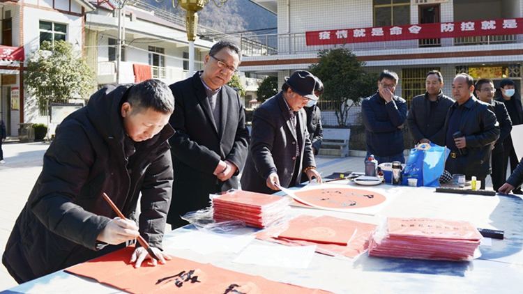活動期間,我校書法家協(xié)會副主席、陜西毛體書法藝術(shù)研究院副院長劉全民,藝術(shù)學(xué)院教師張長林現(xiàn)場展紙揮毫,為群眾書寫、贈送春聯(lián),送去新春祝福。慕名前來的群眾絡(luò)繹不絕,爭相收藏自己喜愛的春聯(lián),大家笑顏綻放,為和坪村帶來了濃濃的年味和文化氣息。