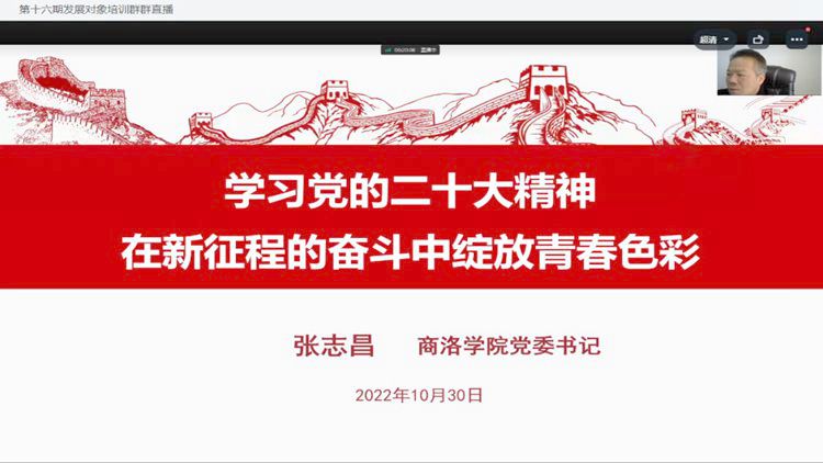 為深入學(xué)習(xí)貫徹黨的二十大精神,切實(shí)做好黨員發(fā)展工作,嚴(yán)格把好發(fā)展黨員“入口關(guān)”,強(qiáng)化發(fā)展對(duì)象的黨性意識(shí),保證黨員發(fā)展質(zhì)量,10月30日至11月7日,我校組織開(kāi)展了第十六期黨員發(fā)展對(duì)象培訓(xùn)活動(dòng)。校黨委書(shū)記張志昌、黨委副書(shū)記彭虎軍先后在線為本期發(fā)展對(duì)象作專(zhuān)題輔導(dǎo)報(bào)告。