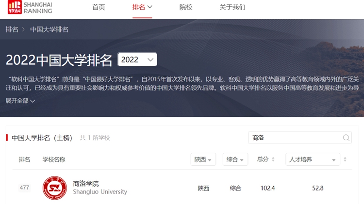 作為具有重要社會影響力和權(quán)威參考價值的高等教育專業(yè)評價機構(gòu),2022年4月19日,軟科正式發(fā)布“2022軟科中國大學排名”,我校位列全國第477名,陜西省第23名。2018年,軟科“世界大學學術(shù)排名(ARWU)”首次發(fā)布2018“中國最好大學排名”內(nèi)地600強名單,我校位居全省第26名,全國第572名。5年來,我校辦學實力與核心競爭力逐年穩(wěn)步提升,全國排名上升95個位次,省內(nèi)排名上升3個位次,辦學影響力和社會聲譽顯著增強。