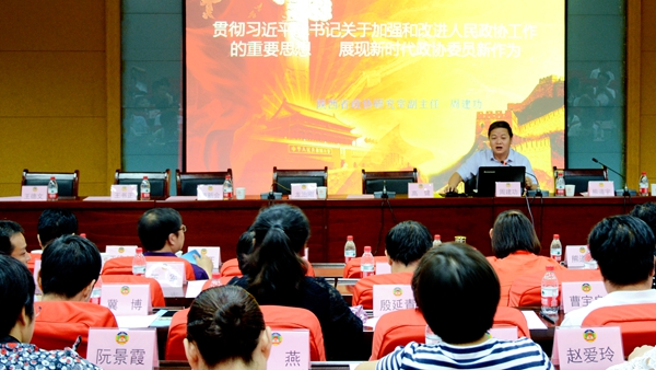 省政協(xié)研究室副主任周建功以《貫徹習近平總書記關于加強和改進人民政協(xié)工作的重要思想展現新時代政協(xié)委員新作為》為題為與會人員作專題輔導報告,他在報告中詳細解讀了習近平總書記關于加強和改進人民政協(xié)工作的重要思想,全面回顧了人民政協(xié)69年的光輝發(fā)展歷程,并就政協(xié)章程的修改、政協(xié)的十項經常性工作、政協(xié)委員履職的基本要求等幾個方面作了深入系統(tǒng)的講解。