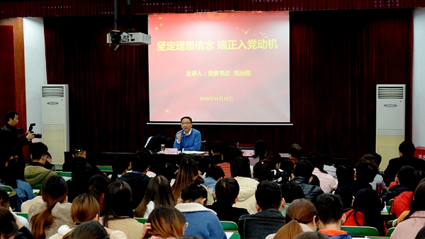 黨委書記龍治剛以《堅(jiān)定理想信念 端正入黨動(dòng)機(jī)》為題,為培訓(xùn)學(xué)員作了專題報(bào)告。報(bào)告中,他帶領(lǐng)學(xué)員們?cè)诤棋臍v史長(zhǎng)河中,剖析崇高的理想信念對(duì)一個(gè)國(guó)家、一個(gè)民族興衰存亡的重要作用,又以深刻的哲學(xué)思辨結(jié)合當(dāng)前社會(huì)實(shí)際,為學(xué)員們解析了實(shí)現(xiàn)理想信念的最佳路徑。他指出,對(duì)生命價(jià)值的無(wú)限追求和解決現(xiàn)實(shí)生活中的問(wèn)題是我們實(shí)現(xiàn)理想信念的“彼岸”和“此岸”,實(shí)現(xiàn)理想信念既要樹立共產(chǎn)主義遠(yuǎn)大理想,還要遵循理想信念建設(shè)的一般規(guī)律。他強(qiáng)調(diào),要把個(gè)人的理想信念與社會(huì)的理想信念統(tǒng)一起來(lái),把理想信念植根于靈魂深處, 保持蓬勃朝氣、昂揚(yáng)銳氣、浩然正氣,腳踏實(shí)地不斷學(xué)習(xí),提高自己的綜合素質(zhì),為實(shí)現(xiàn)個(gè)人的理想而不懈奮斗。大事難事看擔(dān)當(dāng),逆境順境看胸襟,是喜是怒看涵養(yǎng),有舍有得看智慧,是成是敗看堅(jiān)持。他還寄語(yǔ)發(fā)展對(duì)象“八個(gè)堅(jiān)持”,即:堅(jiān)守理想,你就會(huì)有人生的航向;堅(jiān)持學(xué)習(xí),你就會(huì)進(jìn)步;堅(jiān)持勤奮,你就會(huì)成功;堅(jiān)持創(chuàng)造,你就會(huì)有發(fā)展;堅(jiān)持擔(dān)當(dāng),你就會(huì)有信任;堅(jiān)持奉獻(xiàn),你就會(huì)有快樂(lè);堅(jiān)持敬畏,你就會(huì)有安全;堅(jiān)持感恩,你就會(huì)有幸福。