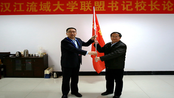 在論壇上,龍治剛向2019年漢江流域聯(lián)盟輪值理事長(zhǎng)單位湖北汽車(chē)工業(yè)學(xué)院授旗,湖北汽車(chē)工業(yè)學(xué)院校長(zhǎng)鐘毓寧接旗。