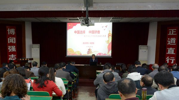 會上,我校圖書館館長楊增強(qiáng)教授作了題為《中國選擇 中國驕傲——新中國七十年來的成就與思考》的專題報(bào)告,報(bào)告講述了新中國波瀾壯闊、激情澎湃、創(chuàng)意萬千、日新月異的歷史性巨變,圍繞“七十年來新中國取得的成就”“七十年來新中國的歷史定位”“七十年來新中國發(fā)展的思考”“對未來發(fā)展的展望”四個(gè)方面進(jìn)行了詳細(xì)的講解。