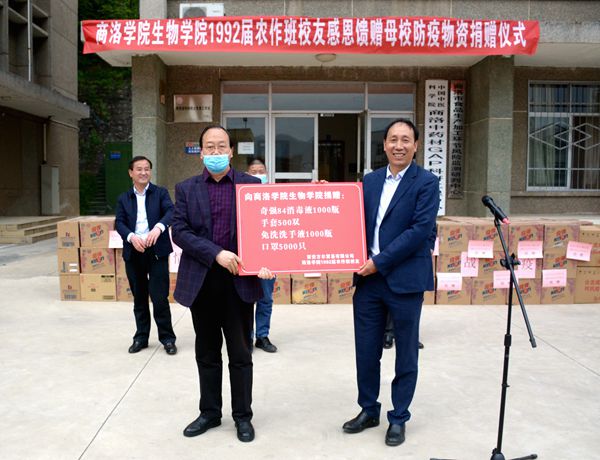 4月22日,我校生物學(xué)院92屆校友向母校捐贈(zèng)價(jià)值10萬元的防疫物資。校長范新會(huì),副校長王新軍,校友代表、洛南縣委副書記馬建琦及西安方爾貿(mào)易有限公司總經(jīng)理林建軍出席在學(xué)校舉行的捐贈(zèng)儀式。院長辦公室、生物學(xué)院負(fù)責(zé)人,教師代表,生物學(xué)院農(nóng)作班92屆部分校友參加捐贈(zèng)儀式。