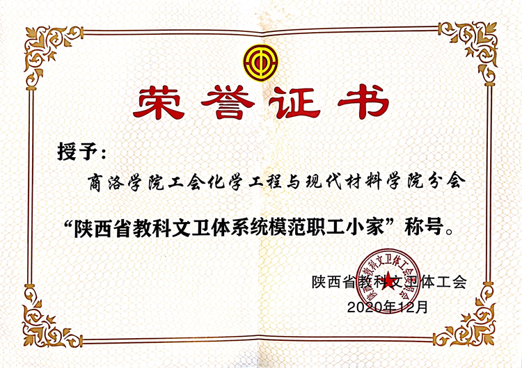 近日,陜西省教科文衛(wèi)體工會(huì)委員會(huì)發(fā)布了《關(guān)于表彰陜西省教科文衛(wèi)體系統(tǒng)模范職工之家、模范職工小家、優(yōu)秀工會(huì)工作者、優(yōu)秀工會(huì)積極分子、優(yōu)秀工會(huì)之友的通報(bào)》(陜教科文衛(wèi)體工字[2020]46號(hào)),校工會(huì)化材學(xué)院分會(huì)被授予陜西省科教文衛(wèi)體系統(tǒng)“模范職工小家”榮譽(yù)稱號(hào)。