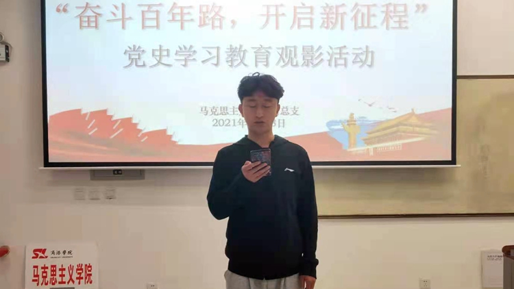 ——組織黨史學習教育觀影活動。4月18日晚,馬克思主義學院在8號教學樓多媒體27教室開展“奮斗百年路,開啟新征程”黨史學習教育觀影活動,2019級和2020級全體同學一起觀看了影片《建黨偉業(yè)》。觀影活動結束后,同學們紛紛表示,先輩們心中裝著國家,將自己的命運與國家前途命運聯(lián)系在一起,將愛國救亡的擔子挑在肩上,正是有了這些革命先輩的努力,才有了我們今天的美好生活。身處和平年代的我們要珍惜好,守護好這份來之不易的美好生活,要積極踐行黨的宗旨,擁護黨的領導,為建設更加富強、民主、文明、和諧、美麗的社會主義現(xiàn)代化強國而不懈奮斗。