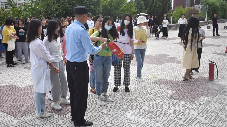 報告結束后,參會師生集體來到二號樓北側(cè)平臺,由保衛(wèi)處治安科科長張柯講解演示了滅火器的相關知識及使用方法,并現(xiàn)場指導師生正確使用滅火器。