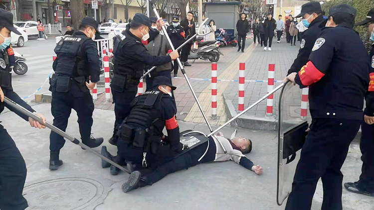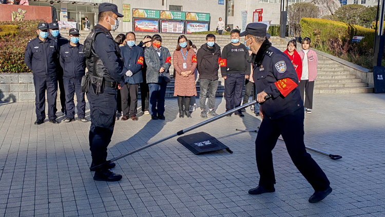 根據(jù)學校“最小警務單元”應急處突演練工作方案安排,本次演練活動包括安全防范技能和器械培訓、警民聯(lián)合武裝巡邏、模擬應急處突現(xiàn)場處置等三個部分,圍繞研判報警、人員疏散、現(xiàn)場控制、配合處置等流程進行,演練場景設置為我校一名學生在校門外,遭到暴恐份子持刀攔路搶劫,校門衛(wèi)值班校警發(fā)現(xiàn)后立即出警,對學生提供保護。校園保衛(wèi)力量、駐校警務室、街面屯警點、社會力量成員迅速集結,對校警進行支援,完成了對案發(fā)現(xiàn)場的封控。公安局110指揮中心指派特警到達現(xiàn)場,“最小警務單元”協(xié)助公安完成對犯罪嫌疑人的抓捕。事件處理完畢后,公安民警與“最小警務單元”成員在我校周邊開展常態(tài)化聯(lián)合巡邏,為廣大師生提供安全保護。