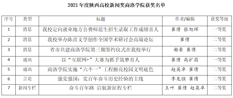 在2021年度陜西高校新聞獎(jiǎng)評(píng)選工作中,我校共送報(bào)各類新聞作品8件,有3件消息類作品、2件通訊類作品、1件言論類和1件新聞專欄類作品獲獎(jiǎng)。其中《我校定向就業(yè)地方公費(fèi)師范生招生錄取工作成績喜人》獲得消息類一等獎(jiǎng),《以“互聯(lián)網(wǎng)+”大賽為抓手筑夢育人》獲得通訊類一等獎(jiǎng)?!段倚Ee辦陳彥文學(xué)創(chuàng)作全國學(xué)術(shù)研討會(huì)高端論壇》《省市共建商洛學(xué)院第三期簽約儀式在我校舉行》獲得消息類二等獎(jiǎng),《商洛學(xué)院實(shí)施“六個(gè)一”工程擦亮學(xué)校文明底色》獲得通訊類二等獎(jiǎng),《強(qiáng)國強(qiáng)黨:黨百年奮斗歷史經(jīng)驗(yàn)的主線》獲得言論類二等獎(jiǎng),《奮斗百年路啟航新征程專欄》獲得新聞專欄類二等獎(jiǎng)。