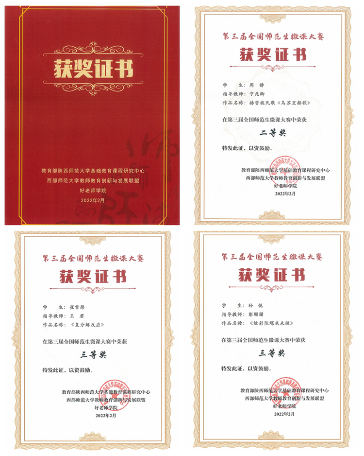 近日,第三屆全國師范生微課大賽結(jié)果公布。由我校教師寧兆卿指導(dǎo)、音樂學(xué)專業(yè)學(xué)生周靜完成的作品《赫哲族民歌<烏蘇里船歌>》榮獲二等獎,教師王君指導(dǎo)、化材學(xué)院學(xué)生崔雪彤完成的《復(fù)分解反應(yīng)》以及教師彭珊珊指導(dǎo)、學(xué)前教育學(xué)專業(yè)學(xué)生孫悅完成的《炫彩陀螺我來做》獲三等獎。