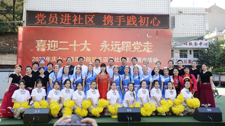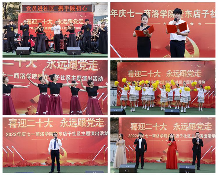 為進(jìn)一步深化黨組織和在職黨員到社區(qū)“雙報(bào)到”機(jī)制,深入開展迎接黨的二十大勝利召開“強(qiáng)國復(fù)興有我”群眾性主題宣傳教育活動(dòng),6月25日上午,由組織部、工會(huì)與東店子社區(qū)聯(lián)合舉辦的“喜迎二十大 永遠(yuǎn)跟黨走”主題演出活動(dòng)在東店子小學(xué)順利舉行。東店子社區(qū)負(fù)責(zé)人,我校黨委組織部、宣傳部、保衛(wèi)部、工會(huì)、團(tuán)委、機(jī)關(guān)各黨總支和藝術(shù)學(xué)院、健康管理學(xué)院黨委負(fù)責(zé)人,商州區(qū)城關(guān)街道辦事處相關(guān)負(fù)責(zé)人及社區(qū)群眾一同觀看了表演。