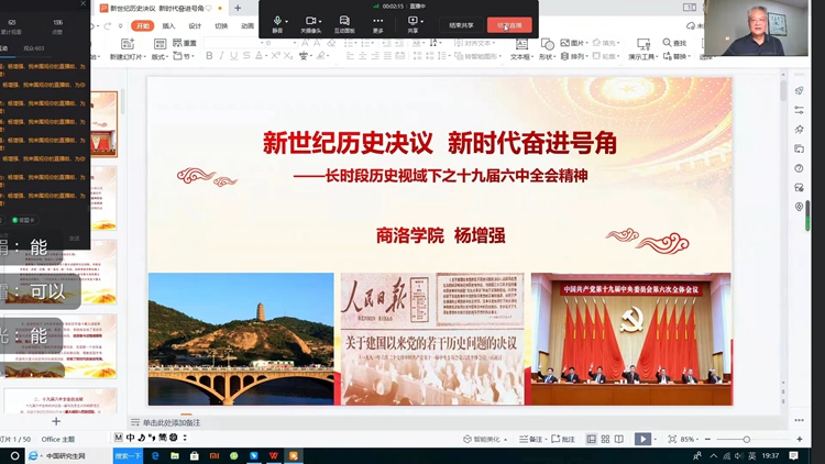 9月22日,校團委邀請馬克思主義學(xué)院教授楊增強開展名為《新世紀歷史決議,新時代奮進號角--長時段歷史視域下十九屆六中全會精神》的線上專題講座,為我校團學(xué)干部和團員代表解讀十九屆六中全會決議。楊增強教授從十九屆六中全會的主要內(nèi)容和歷史定位、十九屆六中全會的貢獻、十八大以來取得的偉大成就、中國共產(chǎn)黨最大的政治優(yōu)勢和特點等方面解讀全會決議,重點解讀了十九屆六中全會的貢獻和十八大以來取得的偉大成就,深刻總結(jié)了黨的十八大以來黨和國家事業(yè)取得的歷史性成就、發(fā)生的歷史性變革。