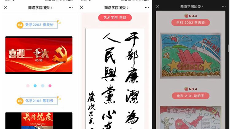 國(guó)慶期間,校團(tuán)委還面向全校師生開(kāi)展了“喜迎黨的二十大、永遠(yuǎn)跟黨走、奮進(jìn)新征程”主題文藝作品征集評(píng)選活動(dòng)。活動(dòng)中,師生將愛(ài)黨愛(ài)國(guó)的熱情傾注筆端,融入作品創(chuàng)作中。前后共收集到文學(xué)類(lèi)、美術(shù)類(lèi)、視頻類(lèi)作品150余件,經(jīng)初審后評(píng)選出39件優(yōu)秀作品在校團(tuán)委公眾號(hào)展播,先后有9000余人次訪(fǎng)問(wèn)、7000余人次參與投票,最終評(píng)選出24件最佳作品予以表彰。