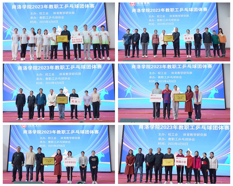 4月8日,我校2023年教職工乒乓球團體賽在丹江校區(qū)體育館順利舉行。來自學校各工會分會以及商洛學院附屬小學、附屬幼兒園的17支代表隊,包括運動員、裁判員及教練200余人參加了比賽。副校長王新軍、商洛學院附屬小學校長趙阿玲、附屬幼兒園園長劉莉莉出席活動并為獲獎代表隊頒獎。工會及體育教學研究部相關(guān)負責人參加活動。
