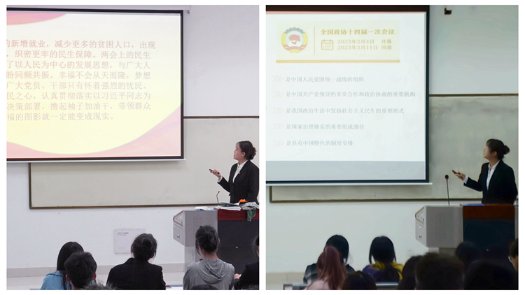 宣講團(tuán)成員從會議概括、會議熱點(diǎn)、會議內(nèi)容和新時代青年四個方面解讀了“深悟全國兩會精神凝聚奮進(jìn)力量”,從“治國有常,而利民為本”和“為政貴在行,民生重在實(shí)”兩個方面解讀了“全國學(xué)兩會精神弘揚(yáng)時代新風(fēng)”。帶領(lǐng)大家深刻領(lǐng)悟了習(xí)近平總書記系列重要講話所體現(xiàn)的鮮明人民立場,所蘊(yùn)含的深厚人民情懷。也讓參會學(xué)生明白了作為新時代的青年一定要應(yīng)志存高遠(yuǎn)、忠于祖國,敢于擔(dān)當(dāng)、勇于奮斗,努力做新時代具有責(zé)任意識和創(chuàng)新精神的建設(shè)者。
