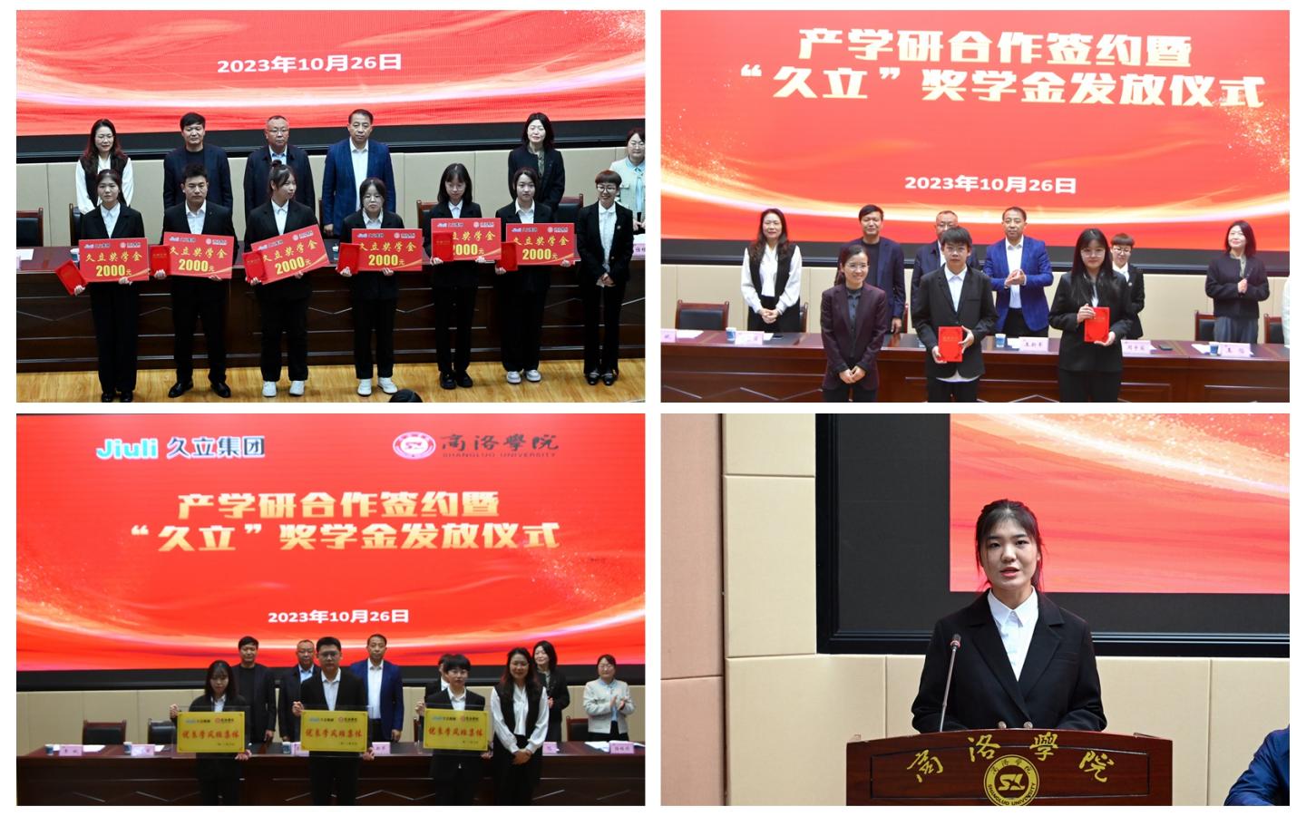 儀式上,化材學院院長周春生和周宇賓分別代表校企雙方簽訂了《商洛學院久立集團共建產(chǎn)學研基地協(xié)議》。周宇賓為首屆獲得“久立”獎學金的10名學生頒發(fā)榮譽證書和獎學金。久立集團人力資源部經(jīng)理馬蓉麗為首批“久立”優(yōu)良學風班集體頒發(fā)獎牌和獎金,久立集團人力資源部副經(jīng)理吳旭群為首屆獲得“久立”獎學提名獎的2名學生頒發(fā)榮譽證書。