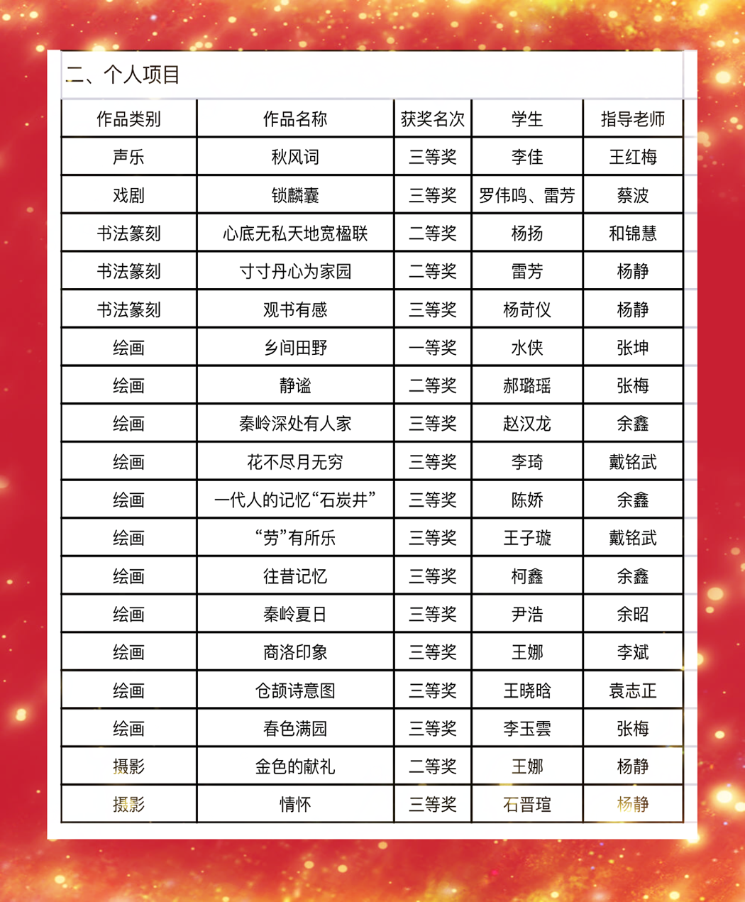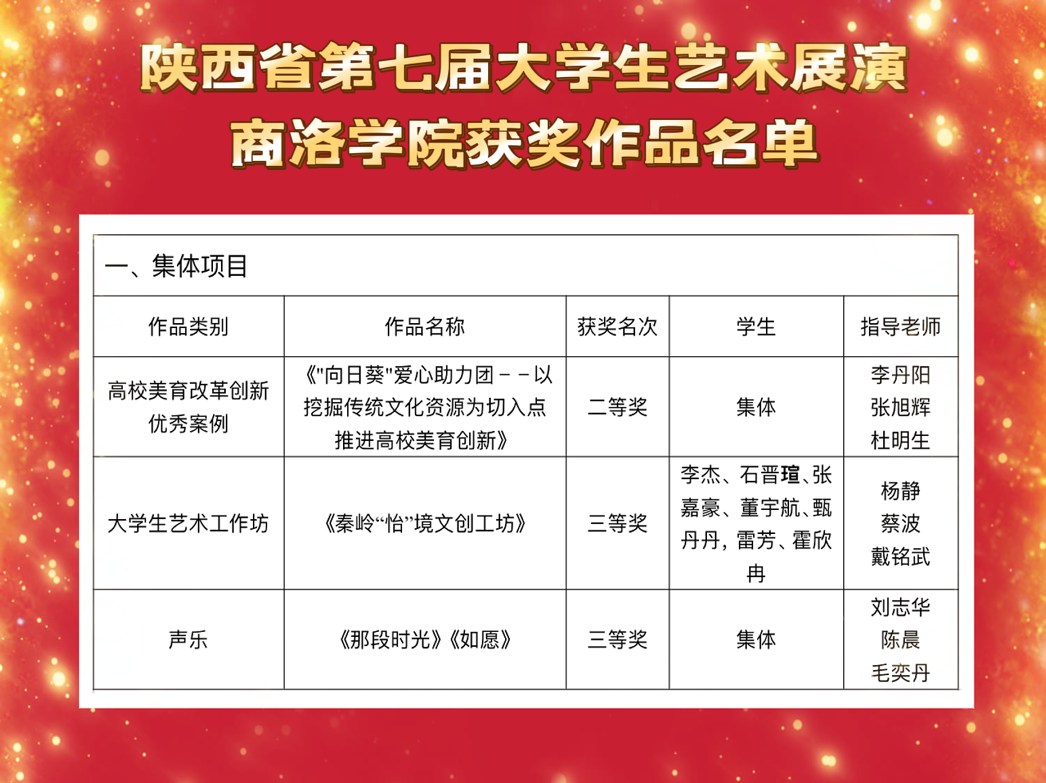 近日,由陜西省教育廳主辦的陜西省第七屆大學(xué)生藝術(shù)展演活動(dòng)評(píng)選結(jié)果揭曉。我校師生在本屆藝術(shù)展演活動(dòng)中取得優(yōu)異成績(jī),喜獲21個(gè)獎(jiǎng)項(xiàng),其中藝術(shù)表演類三等獎(jiǎng)3項(xiàng);藝術(shù)作品類一等獎(jiǎng)1項(xiàng)、二等獎(jiǎng)4項(xiàng)、11項(xiàng);高校美育改革創(chuàng)新優(yōu)秀案例二等獎(jiǎng)1項(xiàng);大學(xué)生藝術(shù)實(shí)踐工作坊獎(jiǎng)三等獎(jiǎng)1項(xiàng)。