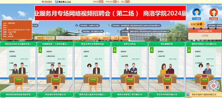 為充分落實2024屆畢業(yè)生就業(yè)“百日沖刺”行動方案,全面促進2024屆畢業(yè)生更加充分、更高質(zhì)量就業(yè),6月7日,我校依托貓頭鷹云就業(yè)平臺舉辦2024屆畢業(yè)生春季綜合類暨民營企業(yè)服務月專場網(wǎng)絡視頻招聘會(第二場)。通過搭建“互聯(lián)網(wǎng)+視聘”線上平臺,精準對接畢業(yè)生求職需求,促進畢業(yè)生實現(xiàn)更高質(zhì)量、更加充分就業(yè)。本次招聘會由省教育廳、省就業(yè)留學中心指導,我校和商洛市人社局主辦,我校就業(yè)中心和商洛市人才中心承辦。