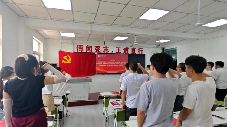 畢業(yè)生黨員面向黨旗,莊嚴地舉起右手,在字字鏗鏘中重溫入黨誓詞,追憶入黨初心,激勵全體畢業(yè)生黨員賡續(xù)紅色血脈,強化黨員意識,進一步激發(fā)黨員使命感和責任感,終身踐行黨旗下的錚錚誓言,做新時代合格的“答卷人”。