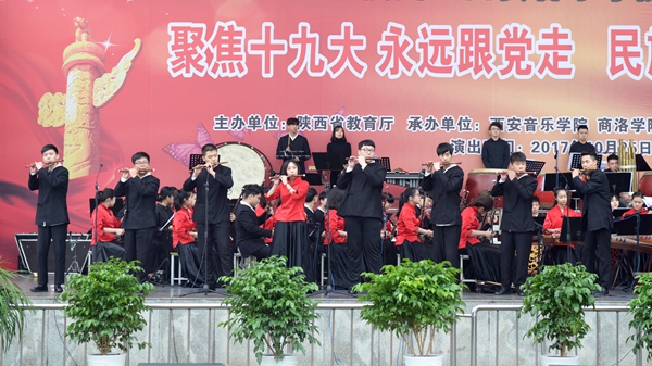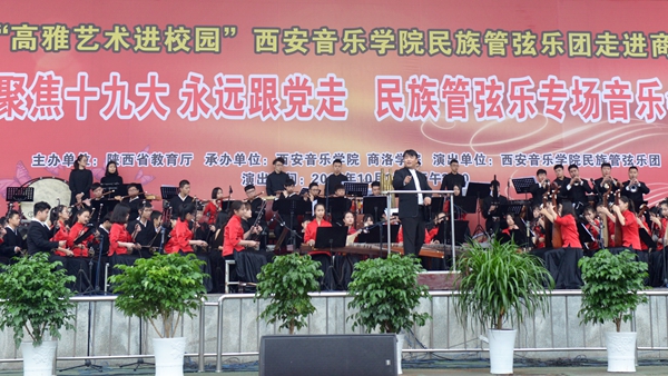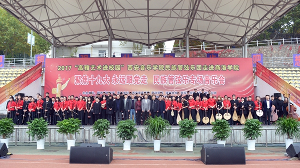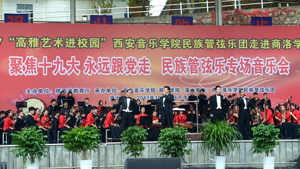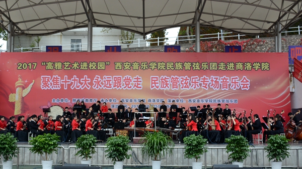 10月25日,由陜西省教育廳主辦的陜西省2017年“高雅藝術(shù)進校園”系列活動——西安音樂學(xué)院民族管弦樂專場音樂會在我校舉辦,音樂會以“聚焦十九大 永遠跟黨走”為主題。來自西安音樂學(xué)院的85名演員為我校師生奉獻了一場精彩的視聽盛宴。西安音樂學(xué)院紀(jì)委書記劉曉霞、副書記全勇,校領(lǐng)導(dǎo)龍治剛、王思懷、魏書堂、劉寶盈、劉勇,來商參加漢江流域大學(xué)聯(lián)盟宣傳思想工作聯(lián)席會的代表與全校師生一同欣賞了音樂會。