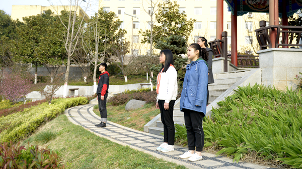 7:10,參加升旗儀式的全體師生列隊整齊、精神飽滿,佇立在升旗臺前?;膶W(xué)院國旗護衛(wèi)隊邁著整齊的步伐走向升旗臺,將國旗護送到升旗臺前。在雄壯的國歌聲中,鮮艷的五星紅旗冉冉升起,迎風(fēng)飄揚?,F(xiàn)場氣氛莊嚴肅穆,在場的每個人都神情嚴肅,心潮澎湃。在運動景觀平臺晨讀和學(xué)苑路行走的同學(xué)聽到國歌聲,也立即面朝國旗方向肅立行注目禮,向國旗表達最崇高的敬意。