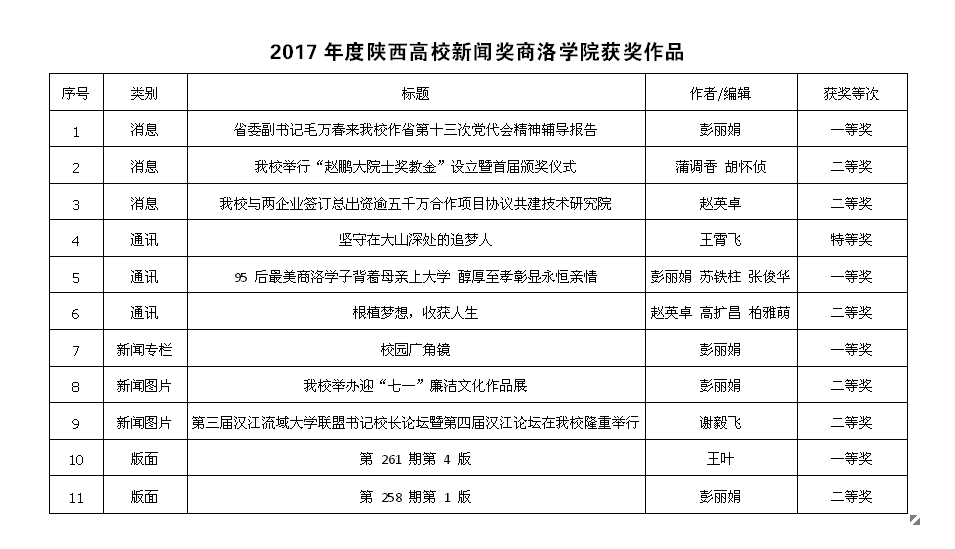 在2017年度陜西高校新聞獎(jiǎng)評(píng)選中,我校共有3件消息類作品、3件通訊類作品、1件新聞專欄類、2件新聞圖片類、2件版面類作品獲獎(jiǎng)。其中《省委副書記毛萬(wàn)春來(lái)我校作省第十三次黨代會(huì)精神輔導(dǎo)報(bào)告》獲得消息類一等獎(jiǎng),《我校舉行“趙鵬大院士獎(jiǎng)教金”設(shè)立暨首屆頒獎(jiǎng)儀式》《我校與兩企業(yè)簽訂總出資逾五千萬(wàn)合作項(xiàng)目協(xié)議共建技術(shù)研究院》獲得消息類二等獎(jiǎng);《堅(jiān)守在大山深處的追夢(mèng)人》獲得通訊類特等獎(jiǎng),《95后最美商洛學(xué)子背著母親上大學(xué) 醇厚至孝彰顯永恒親情》獲得通訊類一等獎(jiǎng),《根植夢(mèng)想,收獲人生》獲得通訊類二等獎(jiǎng);《校園廣角鏡》獲得新聞專欄類一等獎(jiǎng);《我校舉辦迎“七一”廉潔文化作品展》《第三屆漢江流域大學(xué)聯(lián)盟書記校長(zhǎng)論壇暨第四屆漢江論壇在我校隆重舉行》獲得新聞圖片類二等獎(jiǎng);校報(bào)第261 期第 4 版獲得版面類一等獎(jiǎng),第258 期第 1 版獲得版面類二等獎(jiǎng)。