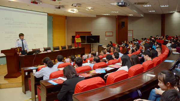 王思懷代表師生對(duì)此次稅法活動(dòng)走進(jìn)我校表示歡迎并發(fā)表講話。他指出,我校歷來高度重視加強(qiáng)師生法治教育、安全教育和誠(chéng)信教育,在經(jīng)管學(xué)院開設(shè)了稅法課程,借助課堂教學(xué)和每年入學(xué)教育、國(guó)家憲法日等節(jié)點(diǎn)開展全校師生參與度高的法律知識(shí)普及系列主題活動(dòng),加大普法宣傳力度,在師生頭腦中樹立起了較強(qiáng)的法律意識(shí)。他表示,開展稅法進(jìn)校園活動(dòng)既可以進(jìn)一步普及稅法知識(shí),增強(qiáng)師生稅法意識(shí),也為落實(shí)雙方之間的戰(zhàn)略合作協(xié)議開辟了一條新路徑。我們將以此為契機(jī),進(jìn)一步深入學(xué)習(xí)黨的十九大報(bào)告有關(guān)財(cái)稅體制改革目標(biāo)和任務(wù)的論述,深入學(xué)習(xí)我國(guó)稅改所取得的成效、未來深化改革所涉及的增值稅、個(gè)人所得稅以及新房地產(chǎn)稅三大熱點(diǎn)稅種改革,廣泛學(xué)習(xí)宣講稅法知識(shí),進(jìn)一步增強(qiáng)全校師生稅收法治觀念。