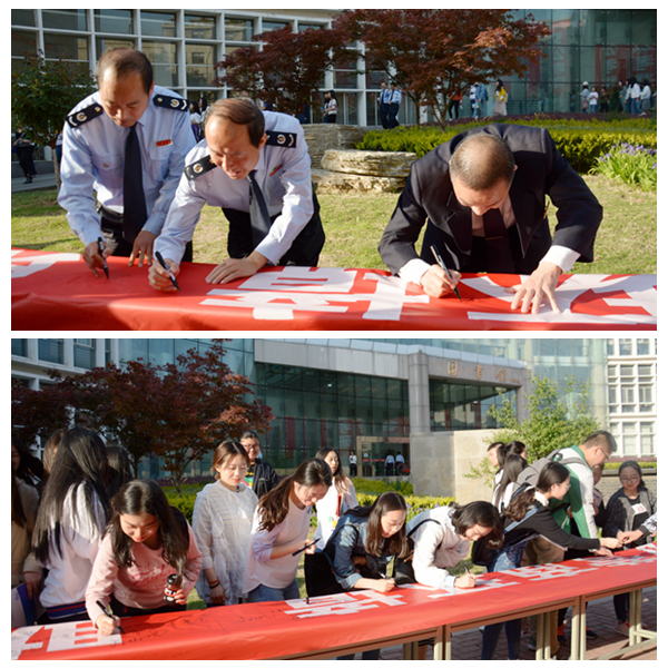 聽完講座后,師生們紛紛在“優(yōu)化稅收營(yíng)商環(huán)境 助力經(jīng)濟(jì)高質(zhì)量發(fā)展”宣傳橫幅上簽名,表達(dá)自己爭(zhēng)做守法納稅人的決心。