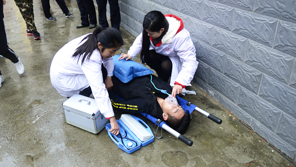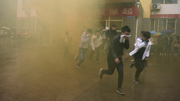 ?演練活動以我校一棟男生公寓樓起火為假設情景,共分為“逃生演練”“火場救援”和“滅火演示”三個部分。隨著指揮員一聲令下,模擬活動開始,“火災現場”頓時濃煙滾滾,火險警報響起,4名同學從“火災現場”逃離出來并大聲呼救。我校立刻啟動應急預案,輔導員、公寓管理員、保衛(wèi)人員迅速趕到現場,引導學生有序疏散,師生開展“逃生演練”進行自救,并在第一時間撥打119火警電話。消防員接到報警后立即出動,駕駛消防車火速趕來。同學們聽從引導,動作迅速,用濕毛巾捂住口鼻,彎腰靠右側從“失火”的樓道中有序撤離到指定安全區(qū)域。隨后,消防人員還模擬演練了“火場搜救被困學生”,醫(yī)護人員對“被搜救學生”模擬進行了“治療檢查”,消防支隊啟動消防車在火災現場進行“滅火演示”。至此,在各相關部門的密切合作和全體同學的共同配合下,本次火災應急疏散與救援演練活動圓滿完成。
