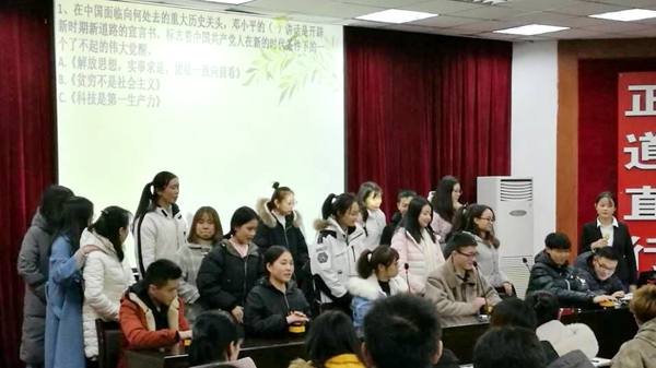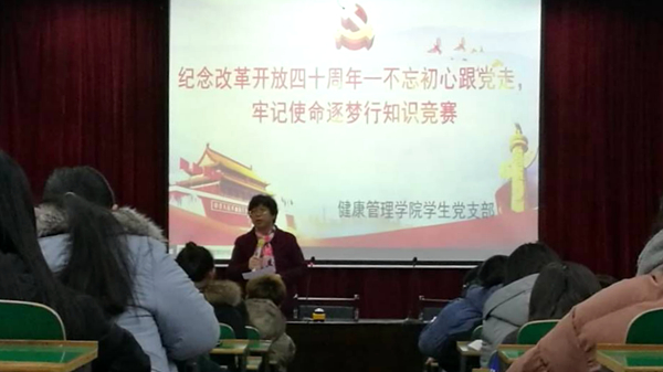 為慶祝改革開(kāi)放40周年,深入學(xué)習(xí)宣傳黨的十九大精神,激發(fā)學(xué)生黨員飲水思源的感恩意識(shí)和開(kāi)拓創(chuàng)新的進(jìn)取精神,12月17日晚,健康管理學(xué)院舉辦了“不忘初心跟黨走 牢記使命逐夢(mèng)行”主題知識(shí)競(jìng)賽。該院黨總支負(fù)責(zé)人,學(xué)生黨員、發(fā)展對(duì)象、積極分子和入黨申請(qǐng)人200余人參加活動(dòng)。