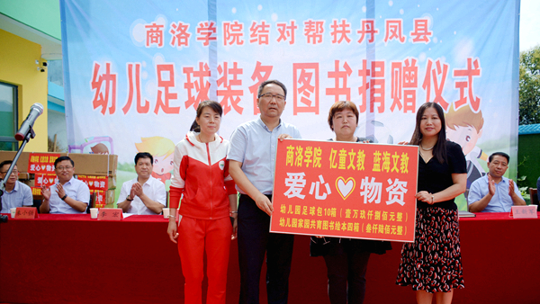 7月9日,我校與武漢億童文教有限公司、陜西藍(lán)海文教科技有限公司攜手為丹鳳縣棣花鎮(zhèn)兩嶺幼兒園送去愛心足球運(yùn)動(dòng)包、愛心圖書等價(jià)值貳萬多元的物資。校雙百工程領(lǐng)導(dǎo)小組組長、黨委書記龍治剛,副組長、副校長劉寶盈,丹鳳縣副縣長楊思飛,武漢億童文教有限公司、陜西藍(lán)海文教科技有限公司顧問專家趙小紅等領(lǐng)導(dǎo)嘉賓出席捐贈(zèng)儀式。我??萍继?、體育教學(xué)研究部及丹鳳縣少兒足球項(xiàng)目負(fù)責(zé)人,丹鳳縣科教體局黨政負(fù)責(zé)人,丹鳳縣農(nóng)業(yè)局相關(guān)負(fù)責(zé)人等工作人員與兩嶺幼兒園全體師生家長共同參加了捐贈(zèng)活動(dòng)。