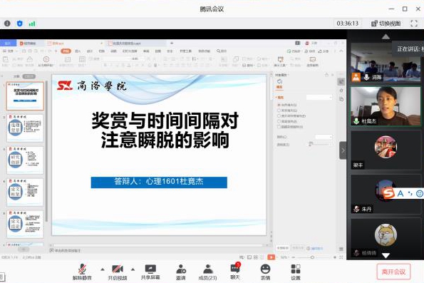 ——線上答辯、井然有序。各學(xué)院根據(jù)實(shí)際情況采取線下線上相結(jié)合的方式組織論文答辯。近2000名學(xué)生使用騰訊會(huì)議、騰訊課堂、釘釘?shù)确€(wěn)定、流暢的網(wǎng)絡(luò)平臺(tái),通過在線直播互動(dòng)或視頻會(huì)議方式進(jìn)行論文答辯。各學(xué)院根據(jù)本院師生的論文寫作與指導(dǎo)進(jìn)展情況,認(rèn)真組織籌劃,嚴(yán)守時(shí)間節(jié)點(diǎn),科學(xué)制定本學(xué)院畢業(yè)論文(設(shè)計(jì))答辯方案及成績(jī)?cè)u(píng)定規(guī)范,提前做好在線答辯細(xì)節(jié)演練,分配好答辯小組,嚴(yán)密答辯流程,確保了答辯工作與往年現(xiàn)場(chǎng)答辯相比等質(zhì)同效、水準(zhǔn)不降。在線上答辯中,合理分配任務(wù),做好排序通知,保持答辯順暢進(jìn)行。在線下現(xiàn)場(chǎng)答辯中,做好室內(nèi)消殺、開窗通風(fēng),避免人員聚集,嚴(yán)格落實(shí)各項(xiàng)防控措施。