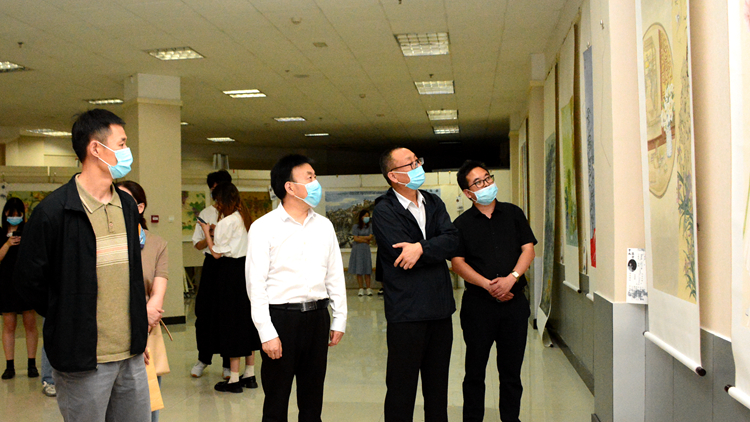 5月31日上午,校黨委書(shū)記張志昌,黨委副書(shū)記彭虎軍、劉勇,副校長(zhǎng)劉寶盈前往圖書(shū)館藝術(shù)展廳參觀指導(dǎo)藝術(shù)學(xué)院美術(shù)學(xué)國(guó)畫(huà)方向2022屆畢業(yè)作品匯報(bào)展。黨委辦公室負(fù)責(zé)人、藝術(shù)學(xué)院黨政負(fù)責(zé)人和師生代表陪同參觀。