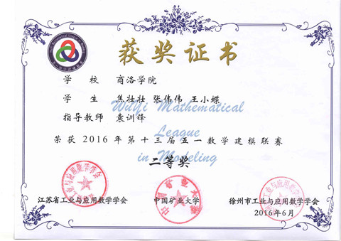 近日,由江蘇省工業(yè)與數(shù)學(xué)應(yīng)用學(xué)會主辦的“第十三屆五一數(shù)學(xué)建模競賽”結(jié)果揭曉,我校電子信息與電氣工程學(xué)院物理學(xué)專業(yè)2014級焦壯壯、張偉偉和電子信息工程專業(yè)2015級王小蝶3位同學(xué)組成的數(shù)學(xué)建模參賽隊喜獲二等獎。這是我校首次組建代表隊參加此項賽事并獲佳績。