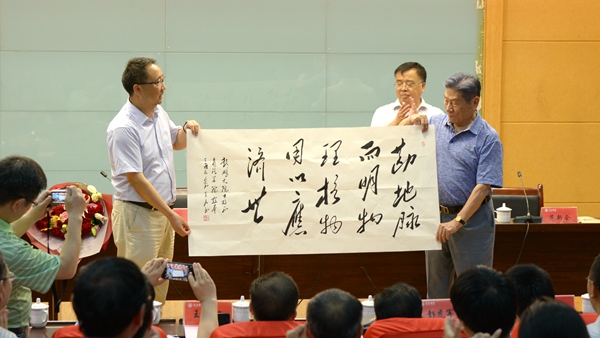 黨委書記龍治剛在講話中以“中國地質(zhì)科學(xué)的領(lǐng)頭羊”“中國地質(zhì)教育的墾荒?!备叨雀爬粟w鵬大院士在中國地質(zhì)學(xué)界的聲譽(yù)和影響力,向師生介紹了趙鵬大教授1949年參加開國大典,1957年作為留蘇研究生在莫斯科大學(xué)聆聽毛澤東主席演講的“人生經(jīng)歷的兩個巔峰時刻”。龍治剛指出,趙鵬大院士受聘我?!半p聘院士”以來,帶領(lǐng)團(tuán)隊為我校的學(xué)科專業(yè)建設(shè)、科學(xué)研究、人才培養(yǎng)等方面給予了大力的支持和幫助,又決定出資50萬元設(shè)立“趙鵬大院士獎教金”,這是趙院士對我校的厚愛和信任,也是對我校在新形勢下實現(xiàn)持續(xù)發(fā)展的鼓勵和激勵,必將對學(xué)校發(fā)展產(chǎn)生深遠(yuǎn)影響。