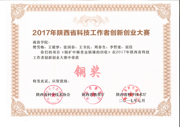 近日,由陜西省科協(xié)、陜西省教育廳、陜西省科技廳主辦的2017年陜西省科技工作者創(chuàng)新創(chuàng)業(yè)大賽在西安舉行,我?;膶W(xué)院教師樊雪梅等7人共同申報的項目《鉬礦中稀貴金屬錸的回收》獲得大賽銅獎。這也是我校教師首次參加全省創(chuàng)新創(chuàng)業(yè)大賽并獲獎。