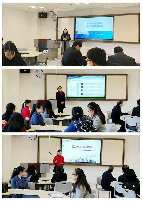 陜西省“課程思政”標(biāo)兵曹寶月老師以“不忘初心,牢記使命,做一位平凡的好老師”為主題,從立德樹人、教育創(chuàng)新,用心選擇參賽課題,潛心設(shè)計(jì)教學(xué)方案,傾心完成教學(xué)過程四個(gè)方面分享了自己在課堂教學(xué)中的具體做法及參加教學(xué)大賽的實(shí)戰(zhàn)經(jīng)驗(yàn);陜西高等學(xué)校青年教師教學(xué)競賽一等獎(jiǎng)獲得者李亞文老師以“做‘四有’好老師,鑄造有效課堂”為主題,從如何做“四有”好老師、怎樣提高教學(xué)質(zhì)量、參加教學(xué)競賽的關(guān)鍵點(diǎn)三個(gè)方面交流了自己的心得體會(huì);學(xué)校首屆課堂教學(xué)創(chuàng)新大賽一等獎(jiǎng)獲得者劉霞老師以“因?yàn)闊釔?,所以?zhí)著”為主題,結(jié)合自己在教學(xué)中遇到的實(shí)際案例,從做走近學(xué)生的老師、做改革創(chuàng)新的老師、做堅(jiān)持初心的老師三個(gè)方面講述了自己在創(chuàng)新課堂教學(xué)方法、準(zhǔn)備教學(xué)大賽中的經(jīng)歷和體悟。
