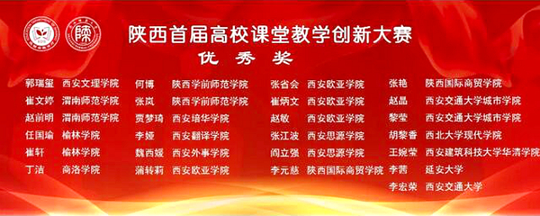 經(jīng)過(guò)激烈角逐,我校生物學(xué)院教師辛欣、經(jīng)管學(xué)院教師房琳、人文學(xué)院教師劉霞榮獲陜西省首屆高校課堂教學(xué)創(chuàng)新大賽二等獎(jiǎng),藝術(shù)學(xué)院教師丁潔榮獲優(yōu)秀獎(jiǎng)。我校教師獲獎(jiǎng)數(shù)量與等次均居于同類院校前列。