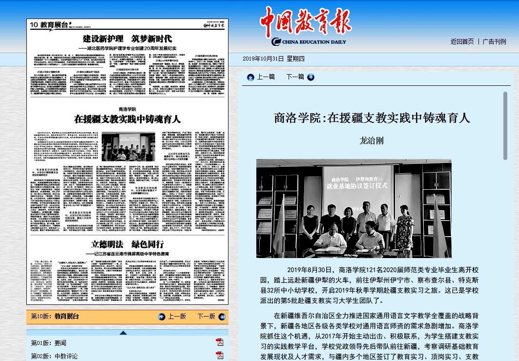 黨委書記龍治剛在《中國教育報(bào)》2019年10月31日教育展臺(tái)版面發(fā)表署名文章《商洛學(xué)院:在援疆支教實(shí)踐中鑄魂育人》,全文如下: