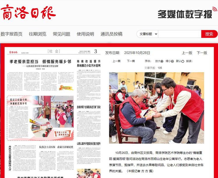 10月26日,由商州區(qū)文旅局、商洛學(xué)院藝術(shù)學(xué)院等主辦的“情暖重陽 愛滿百順”慰問活動在商洛市百順山莊老年公寓舉行。志愿者為老人表演節(jié)目、剪指甲,并送去水果等慰問品,讓老人們感受到來自社會各界的關(guān)愛。 (本報記者 方 方 攝)