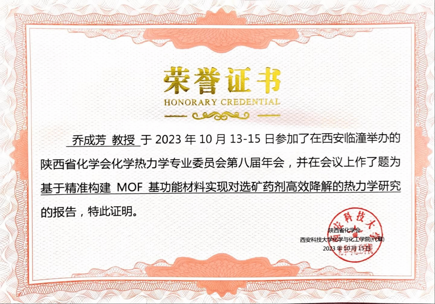化材學(xué)院副院長喬成芳教授作了題為“基于精準(zhǔn)構(gòu)建 MOF 基功能材料實(shí)現(xiàn)對選礦藥劑高效降解的熱力學(xué)研究”的大會(huì)報(bào)告,分享了“MOF基功能材料熱化學(xué)”團(tuán)隊(duì)在尾礦庫區(qū)廢水中金屬離子的檢測、選礦藥劑的高效降解的相關(guān)工作,并與參會(huì)專家進(jìn)行交流。