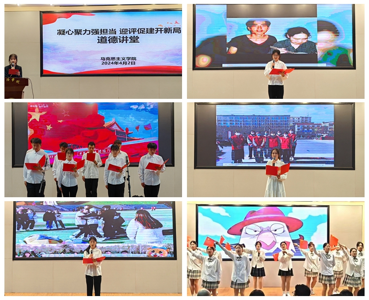 為激發(fā)師生干事創(chuàng)業(yè)熱情,以昂揚(yáng)的精神風(fēng)貌迎接教育部審核評估,4月2日,馬克思主義學(xué)院在學(xué)校圖書館一樓報告廳舉辦了“凝心聚力強(qiáng)擔(dān)當(dāng),迎評促建開新局”道德講堂。校黨委委員、宣傳部部長王霄飛蒞臨指導(dǎo),馬克思主義學(xué)院黨政領(lǐng)導(dǎo)、全體教師及學(xué)生黨員、入黨積極分子、團(tuán)學(xué)干部參加了活動。