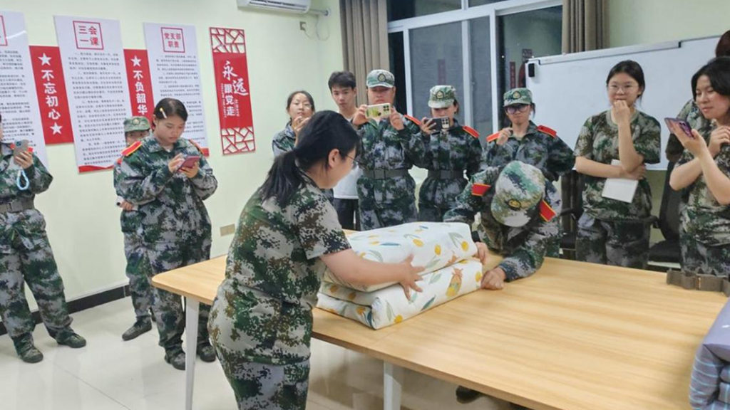 活動期間,教官為同學(xué)們講解了《中國人民解放軍內(nèi)務(wù)條令》相關(guān)要求,圍繞“宿舍物品放置方法”向同學(xué)們進(jìn)行了耐心細(xì)致的講授。教官表示,內(nèi)務(wù)整理并不是簡單的打掃衛(wèi)生,它不僅是技能的學(xué)習(xí),更是一種態(tài)度的體現(xiàn),要時刻保持嚴(yán)謹(jǐn)與專注,從細(xì)節(jié)處塑造品格?;顒蝇F(xiàn)場,教官們向同學(xué)們現(xiàn)場演示了被褥、枕頭整理和擺放,同學(xué)們通過認(rèn)真聽講,結(jié)合教官教授的方法紛紛“上手”整理自己帶來的被褥,并與自己的“作品”合影。這種寓教于樂的教學(xué)活動,豐富了軍事技能訓(xùn)練的內(nèi)容,進(jìn)一步提升了軍訓(xùn)工作的實(shí)效。