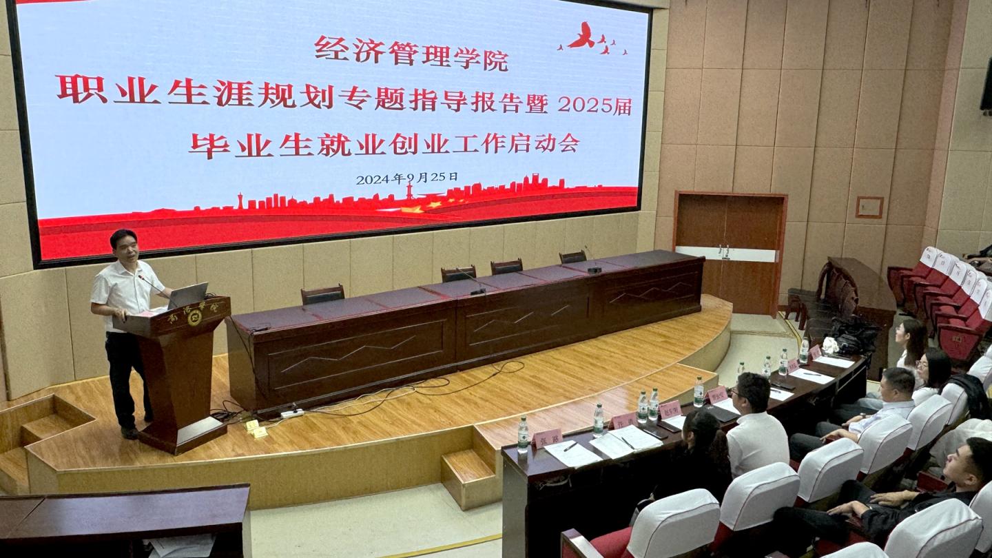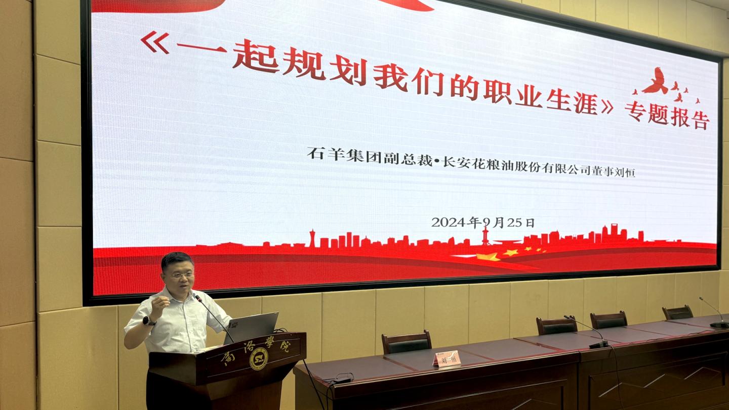 為引導(dǎo)2025屆畢業(yè)生正確認(rèn)識就業(yè)形勢,推動畢業(yè)生實(shí)現(xiàn)高質(zhì)量就業(yè),9月25日下午,經(jīng)濟(jì)管理學(xué)院舉辦職業(yè)生涯規(guī)劃專題指導(dǎo)報(bào)告暨2025屆畢業(yè)生就業(yè)創(chuàng)業(yè)工作啟動會。石羊集團(tuán)副總裁、長安花糧油股份有限公司董事劉恒,學(xué)院黨委副書記賈長安,長安花糧油股份有限公司相關(guān)人員以及經(jīng)管學(xué)院畢業(yè)班輔導(dǎo)員、全體2025屆畢業(yè)生參加會議。動員會由賈長安主持。