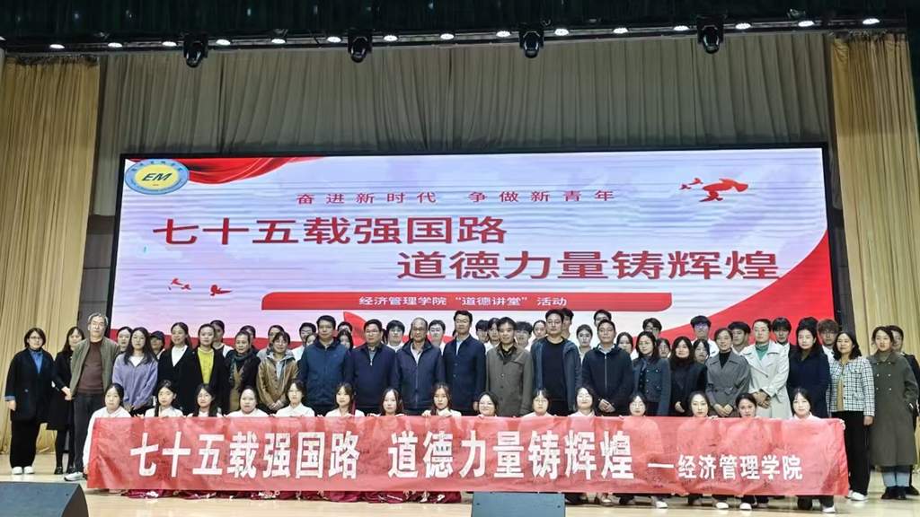 為宣傳學(xué)習(xí)道德模范事跡,創(chuàng)新開展大學(xué)生思想道德教育、弘揚(yáng)社會(huì)主義核心價(jià)值觀形式,激發(fā)青年學(xué)生愛國之情、強(qiáng)國之志,10月30日,經(jīng)濟(jì)管理學(xué)院舉辦了“七十五載強(qiáng)國路,道德力量鑄輝煌”主題道德講堂。學(xué)校黨委委員、宣傳部部長(zhǎng)王霄飛,經(jīng)管學(xué)院黨政領(lǐng)導(dǎo)、全體教職工及學(xué)生代表參加活動(dòng)。