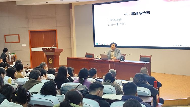 為拓寬思想政治理論課教師學(xué)術(shù)新視野,夯實(shí)研究中國(guó)共產(chǎn)黨歷史的理論基礎(chǔ),11月22日上午,國(guó)務(wù)院政府特殊津貼專家、教育部長(zhǎng)江學(xué)者特聘教授、教育部歷史學(xué)教學(xué)指導(dǎo)委員會(huì)委員、南開(kāi)大學(xué)杰出教授李金錚教授應(yīng)邀為馬克思主義師生作了題為《中共革命史若干問(wèn)題管窺》的學(xué)術(shù)報(bào)告。馬克思主義學(xué)院師生150余人參加了學(xué)術(shù)報(bào)告。報(bào)告會(huì)由院長(zhǎng)蔣正治主持。